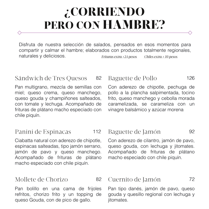 Ciabatta natural con aderezo de chipotle, espinacas salteadas, tipo jamón serrano, jamón de pavo y queso manchego. Acompañado de frituras de plátano macho especiado con chile piquín.